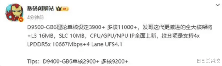性能方面,Find X9搭载天玑9500处理器,该芯片目前还没有确定,不过一些参数也曝光了,有消息称天玑9500在GeekBench6理论单核跑分3900多,多核达到11000万多,全大核架构+L3 16MB,这水平都赶得上电脑CPU了吧,安兔兔跑分400万+。相比于天玑9400,它的GB6跑分仅2900多,多核不到10000万,安兔兔跑分300万+,可见性能的迭代是非常猛,Find X9确实值得期待。